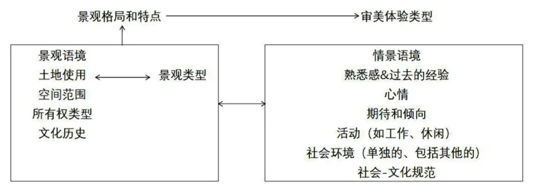 如圖2所示,審美體驗(yàn)在可感知領(lǐng)域內(nèi)的景觀格局中產(chǎn)生,而景觀語(yǔ)境和情境語(yǔ)境(situational context)以圖3所示的方式影響審美體驗(yàn)。景觀類型依據(jù)土地使用、空間范圍、所有權(quán)類型和文化歷史進(jìn)行劃分,不同類型的景觀會(huì)產(chǎn)生不同的格局和特點(diǎn),進(jìn)而產(chǎn)生不同的審美體驗(yàn)。情境語(yǔ)境對(duì)審美體驗(yàn)的影響體現(xiàn)在個(gè)人和社會(huì)兩方面,前者包括熟悉感和過(guò)去的經(jīng)驗(yàn)、心情、期待和傾向、活動(dòng),后者包括社會(huì)環(huán)境和社會(huì)—文化規(guī)范。這些因素會(huì)構(gòu)成不同的情境,同一個(gè)人如果身處不同情境,即使面對(duì)同一景觀,也會(huì)產(chǎn)生不同的感知,進(jìn)而產(chǎn)生不同的審美體驗(yàn)。此外,景觀語(yǔ)境與情境語(yǔ)境之間也存在相互作用:一方面,特定的景觀類型要求觀察者持有相應(yīng)意圖,這會(huì)影響人們?cè)诟兄坝^時(shí)的社會(huì)規(guī)范與個(gè)人期待;另一方面,觀察者的意圖不同,他所秉持的社會(huì)規(guī)范與個(gè)人期待也就不同,這些規(guī)范和期待會(huì)影響不同類型的景觀中可感知到的特點(diǎn)。
