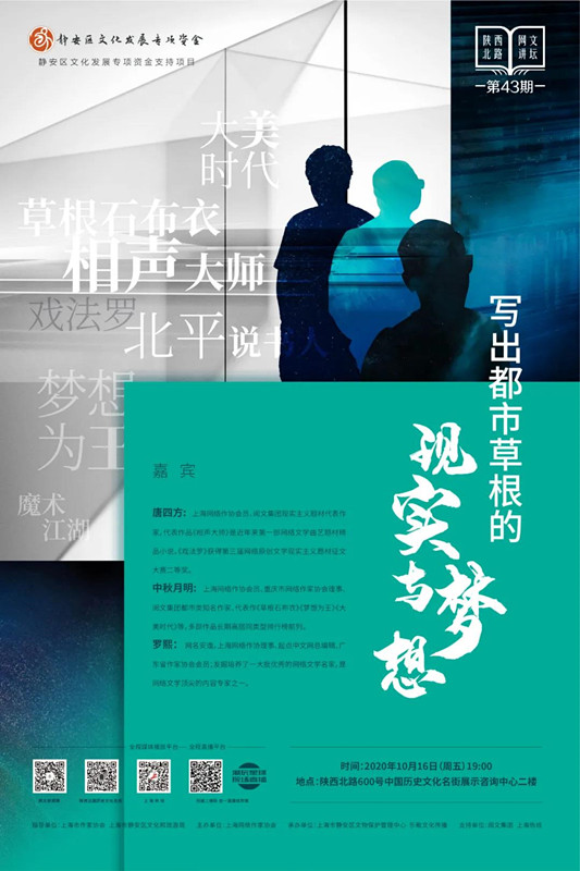 近幾年來現(xiàn)實主義題材網(wǎng)文作品影響日益強大,口碑、銷量俱佳的網(wǎng)絡(luò)小說改變了人們印象中網(wǎng)絡(luò)文學只是“言情穿越升級打怪”的文字,由于絕大多數(shù)網(wǎng)絡(luò)作家都是在工作之余寫作,他們筆下的現(xiàn)實生活反而更豐富多彩、更有質(zhì)感。本期陜西北路網(wǎng)文講壇邀請的兩位嘉賓唐四方、中秋月明便是這類寫作的代表作家,作品《相聲大師》《戲法羅》(唐四方)、《草根石布衣》《夢想為王》《大美時代》《我只想自力更生》(中秋月明)都在平臺有很高的閱讀量,《相聲大師》《草根石布衣》入選了國家圖書館永久收藏的100部網(wǎng)絡(luò)小說。