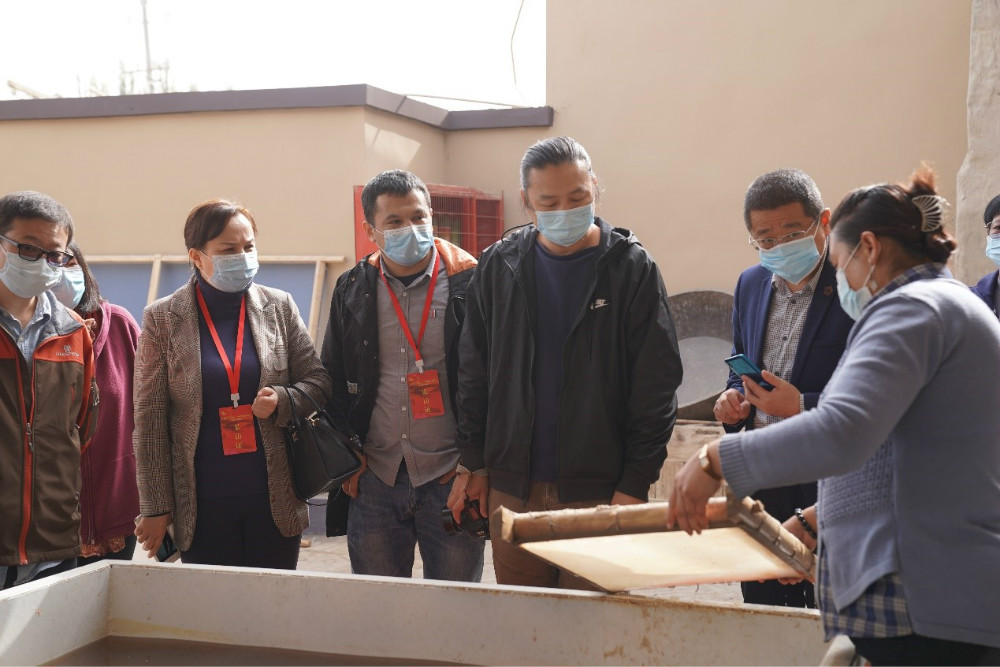 帶領群眾脫貧奔小康,需要大力發(fā)展產(chǎn)業(yè),促進就業(yè)。和田發(fā)展了“龍頭企業(yè)+基地+合作社+農戶”模式的特色養(yǎng)殖產(chǎn)業(yè),企業(yè)規(guī)模養(yǎng)殖經(jīng)營,通過托管分紅和吸納就業(yè),帶動貧困戶增收。采訪團參觀了和田市一家養(yǎng)兔基地、皮山縣的多胎羊繁育基地、洛浦縣一家乳業(yè)公司種奶牛繁育基地和種鴿繁育基地,了解當?shù)囟鄻踊奶厣a(chǎn)業(yè)扶貧運作方式。在和田縣的核桃交易中心,作家們了解到,憑借著當?shù)睾颂耶a(chǎn)業(yè)優(yōu)勢,交易中心充分發(fā)揮龍頭企業(yè)的“引擎”作用,利用信息技術打造便利的市場交易平臺,提供多樣化就業(yè)崗位,為農戶提供技術支持等實現(xiàn)了為貧困戶增收致富。作家們看到交易中心一袋袋成堆的核桃即將運往全國各地,忙碌的農戶們雖然辛苦但又充滿活力。在和田,不僅經(jīng)濟發(fā)展了,群眾的生活得到保障,傳統(tǒng)文化也散發(fā)著新生的活力,如當?shù)靥厣陌厝R斯綢和手工制作的桑皮紙,都得到了保護與扶持。