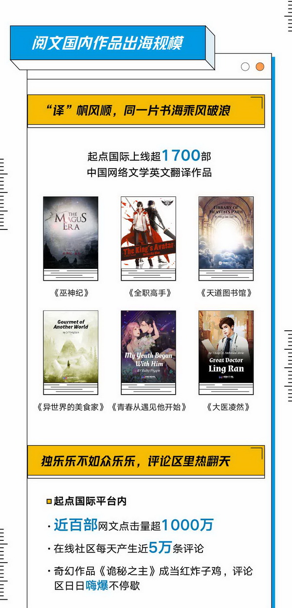 據(jù)《白皮書》發(fā)布,隨著閱文集團(tuán)旗下起點國際(Webnovel)和世界各地譯者的持續(xù)合作,平臺上線的中國網(wǎng)絡(luò)文學(xué)英文翻譯作品數(shù)量持續(xù)增長,已超1700部。這些中國網(wǎng)絡(luò)文學(xué)正在得到越來越多全球讀者的歡迎與認(rèn)可。在作品類型上,囊括玄幻、奇幻、都市等多元類型,內(nèi)容豐富多樣,如體現(xiàn)中國傳統(tǒng)文化尊師重道的《天道圖書館》,體現(xiàn)現(xiàn)代中國都市風(fēng)貌和醫(yī)學(xué)發(fā)展的《大醫(yī)凌然》,講述當(dāng)代年輕人熱血拼搏故事的《全職高手》等。