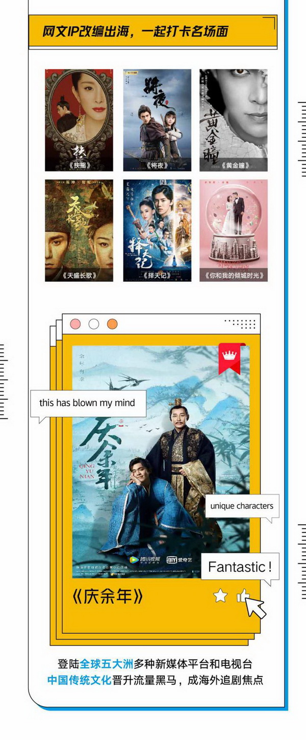 在對外授權(quán)方面,閱文集團(tuán)已向日韓地區(qū)及泰國、越南等東南亞多國,以及美國、英國、法國、土耳其等歐美多地授權(quán)數(shù)字出版和實體圖書出版,授權(quán)作品700余部。其中《鬼吹燈》系列的英文版圖書已由企鵝蘭登書屋出版;《全職高手》在日本進(jìn)行紙質(zhì)出版;《斗破蒼穹》等授權(quán)韓文版;《將夜》等授權(quán)泰文版;《盛世茶香》等授權(quán)越南文版;《斗羅大陸》等授權(quán)法文版;《盤龍》等授權(quán)土耳其文版。另外,閱文的網(wǎng)絡(luò)文學(xué)IP改編也正揚(yáng)帆出海?!耙粠б宦贰泵啥碚褂惩扑]片目中有《擇天記》;YouTube等歐美主流視頻網(wǎng)站、東南亞地區(qū)各大電視臺上能看到《扶搖》等諸多人氣IP改編劇集;海外知名流媒體平臺Netflix上《天盛長歌》正進(jìn)入全球千家萬戶;《將夜》獲得第四屆中加國際電影節(jié)“最佳電視劇獎”。不僅是改編成品,原著小說的改編前景亦被看好。閱文集團(tuán)白金作家囧囧有妖作品《許你萬丈光芒好》的改編版權(quán)和電子版權(quán)就向越南進(jìn)行了授權(quán)。