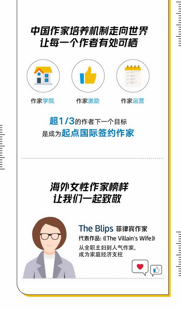 通過創(chuàng)作獲得收入正在推動全球作者生活的改變。例如,菲律賓作家the Blips,她的代表作品《The Villain's Wife》獲得了起點國際在菲律賓舉辦的創(chuàng)作大賽春季賽冠軍。在作品登上起點國際受到眾多讀者歡迎之后,她憑借創(chuàng)作獲得的收入成為家庭經(jīng)濟(jì)支柱。