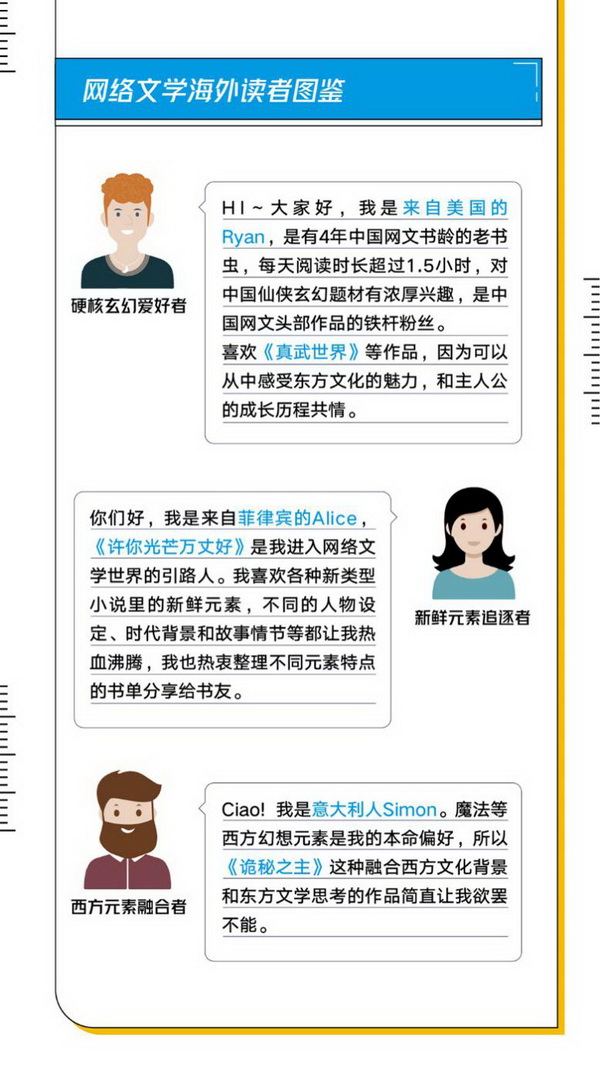 《白皮書》還從用戶的閱讀習(xí)慣和偏好入手,列舉了三種典型的海外用戶:一種是“硬核玄幻愛好者”,對中國仙俠玄幻類型有濃厚興趣,是中國網(wǎng)絡(luò)文學(xué)頭部作品的忠實讀者,喜歡《真武世界》等作品,能從中感受東方文化的魅力,共情主人公成長的歷程。一種是“新鮮元素追逐者”,通過《許你光芒萬丈好》這樣的熱門作品進(jìn)入網(wǎng)絡(luò)文學(xué)的世界,喜歡各種新類型小說里的新鮮元素,如不同的人物設(shè)定、時代背景和故事情節(jié)等,還會整理不同元素特點的書單分享給書友。還有一種是“西方元素融合者”,本身就喜歡魔法等西方幻想元素,喜歡《詭秘之主》這樣融合了西方文化背景和東方文學(xué)思考的作品。