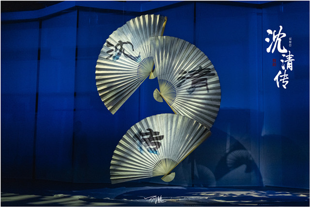 據(jù)本劇的總編導(dǎo)之一柯書劍介紹,在舞蹈設(shè)計編排上,巨幅折扇的運用,是作為環(huán)境移變與劇情轉(zhuǎn)折的提示點和強化點。那么,折扇不僅僅是演員手中的一個道具,更是融入到劇情當中的一個重要角色,承擔(dān)起了強化舞臺空間與劇情演變的功能。比如,當寫有“祭” 字的折扇出現(xiàn)時,提示進入沈清要在祭祀儀式中被投入海中的重要情節(jié),瞬間調(diào)動觀眾情緒,扣人心弦。