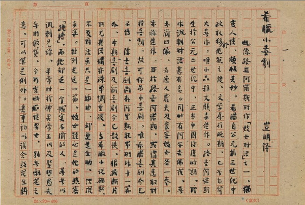 周作人早年留學日本,通曉日文、英文、 希臘文等多種文字,他十分看重日本文學和古希臘文學。日本文學自不必贅言,上述諸多手稿內(nèi)容中可見周作人總頻頻提及日本。而周作人的希臘文學譯作也有二百萬言,大多為晚年完成的。他說:“余一生文字無足稱道,唯暮年所譯希臘對話是五十年來的心愿,識者當自知之?!边@批手稿中,如《希臘小喜劇》《愛說誑的人》《塔伊斯與格呂刻拉》都是與希臘文學歷史相關(guān)。