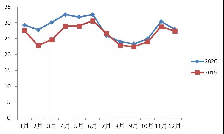 2019~2020年少兒圖書碼洋比重在各個月的變化