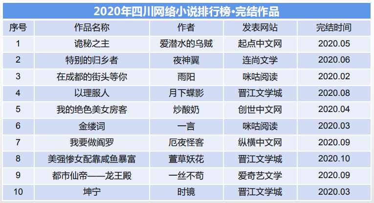 根據(jù)《2020年度四川省網(wǎng)絡(luò)小說排行榜評審工作方案》,經(jīng)初評、終評程序,評選出2020年已完結(jié)網(wǎng)絡(luò)小說《詭秘之主》(愛潛水的烏賊)、未完結(jié)網(wǎng)絡(luò)小說《元尊》(天蠶土豆)等20部作品?,F(xiàn)將名單公示如下。