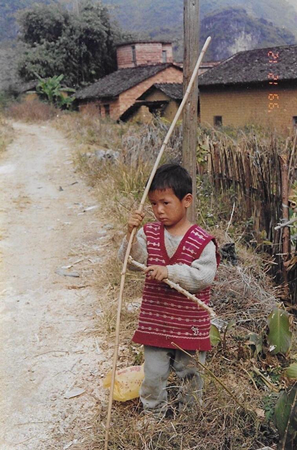 “那里和我的家鄉(xiāng)差不多,都是用泥磚砌的房子,我癡癡地看著那些房子、那些山,仿佛回到了家鄉(xiāng)?!本驮陉愒姼鐝囊粋€山村邊經(jīng)過的時候,看到路邊站著一個五六歲的小男孩,右手拿著一根長長的竹竿,左手拿著一根短短的木棍,他眉頭微蹙,側(cè)著腦袋看著這群不速之客。
