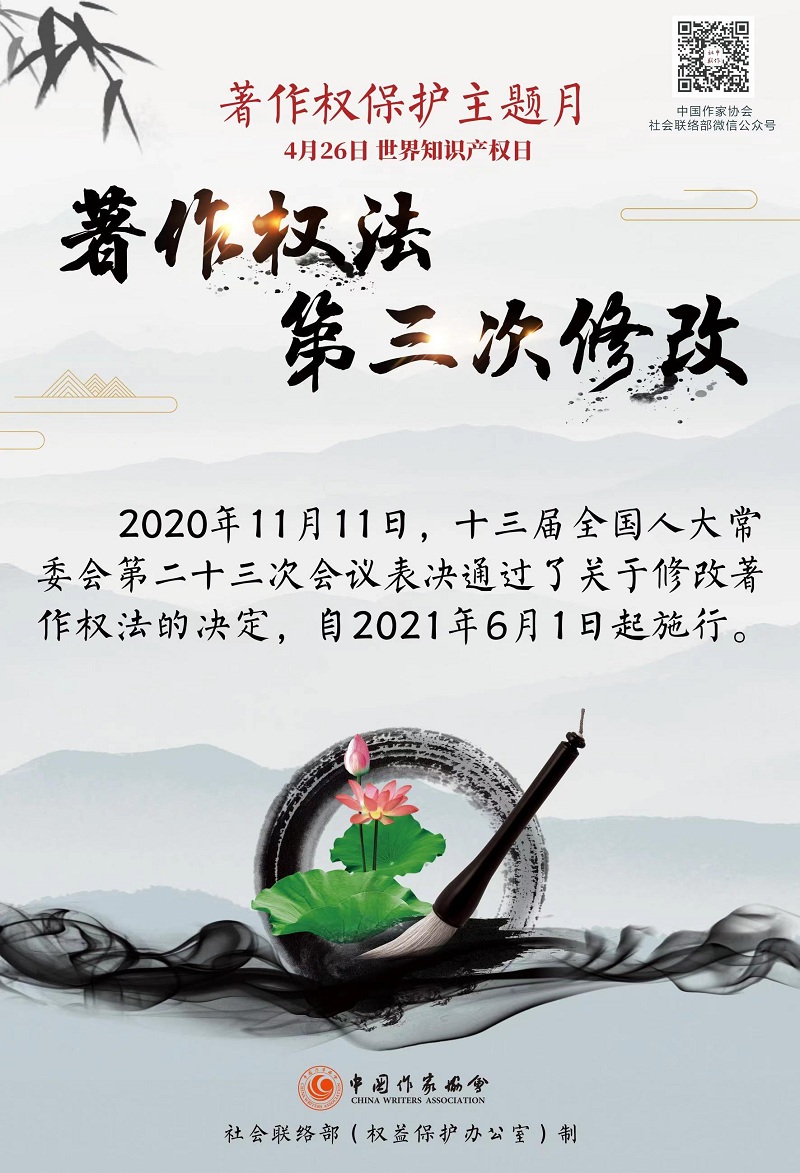 今年4月26日是第21個(gè)世界知識(shí)產(chǎn)權(quán)日。為深入學(xué)習(xí)貫徹習(xí)近平總書(shū)記在中央政治局集體學(xué)習(xí)時(shí)關(guān)于知識(shí)產(chǎn)權(quán)工作的重要講話(huà)精神,宣傳推廣2021年6月1日施行的新修改的《著作權(quán)法》,營(yíng)造濃厚的著作權(quán)保護(hù)氛圍,增強(qiáng)廣大作家尊法學(xué)法守法用法的意識(shí)和能力,探索著作權(quán)保護(hù)工作的新思路、新辦法,中國(guó)作家協(xié)會(huì)社會(huì)聯(lián)絡(luò)部(權(quán)益保護(hù)辦公室)于本月正式啟動(dòng)“著作權(quán)保護(hù)主題月”活動(dòng)。