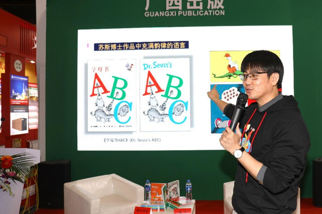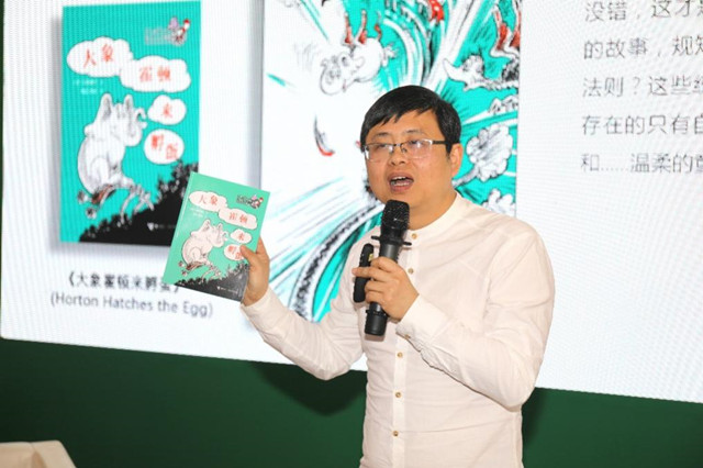 4月2日,由接力出版社主辦的“蘇斯博士經(jīng)典雙語分級(jí)讀”品鮮會(huì)在第34屆北京圖書訂貨會(huì)上舉行,兒童文學(xué)作家、本系列叢書譯者常立和蝸牛英語聯(lián)合創(chuàng)始人李石(蝸牛叔叔)出席活動(dòng)。