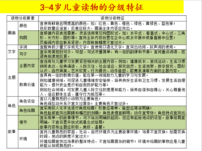 以3-4歲兒童讀物為例,圍繞10個(gè)要素的分級特征描述。