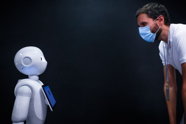 2020年9月10日,在法國巴黎的軟銀機器人公司,機器人Pepper展示檢測人們是否正確佩戴口罩的功能。軟銀機器人Pepper通過自帶的攝像頭掃描人臉,檢測對方有沒有佩戴口罩,并給予禮貌提醒和指導(dǎo)。新華社發(fā)(奧雷利安·莫里薩爾攝)