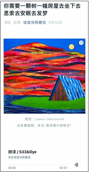 晚上10點微信公號讀詩,如同曾經(jīng)流行的午夜電臺所起到的功用一樣,試圖給出一種溫柔平滑的夜之撫慰