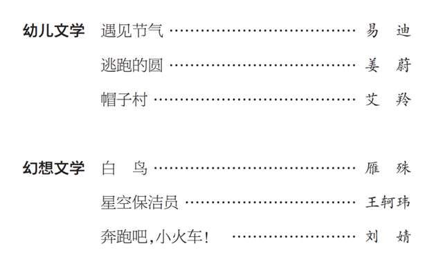 小說、童話、寓言、散文、詩歌、幼兒文學(xué)均可參評。參評作品字?jǐn)?shù)最長不超過1.5萬字。每位作者參評作品只限一篇。