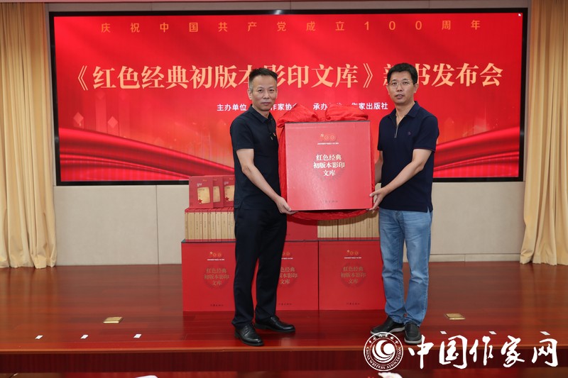 發(fā)布會(huì)現(xiàn)場(chǎng),作家出版社有限公司向中國(guó)現(xiàn)代文學(xué)館捐贈(zèng)了60卷本的《紅色經(jīng)典初版本影印文庫(kù)》。