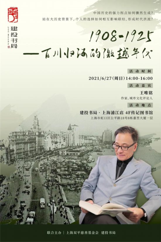 6月27日下午,建投書(shū)局聯(lián)合上海雙平慈善基金會(huì)邀請(qǐng)到作家、城市文化評(píng)論人王唯銘做客建投書(shū)局·上海浦江店,揭開(kāi)1908至1925這一激越年代的歷史面貌,描繪變革時(shí)代背景下的人物群像,講述覺(jué)醒年代中的思潮演變。