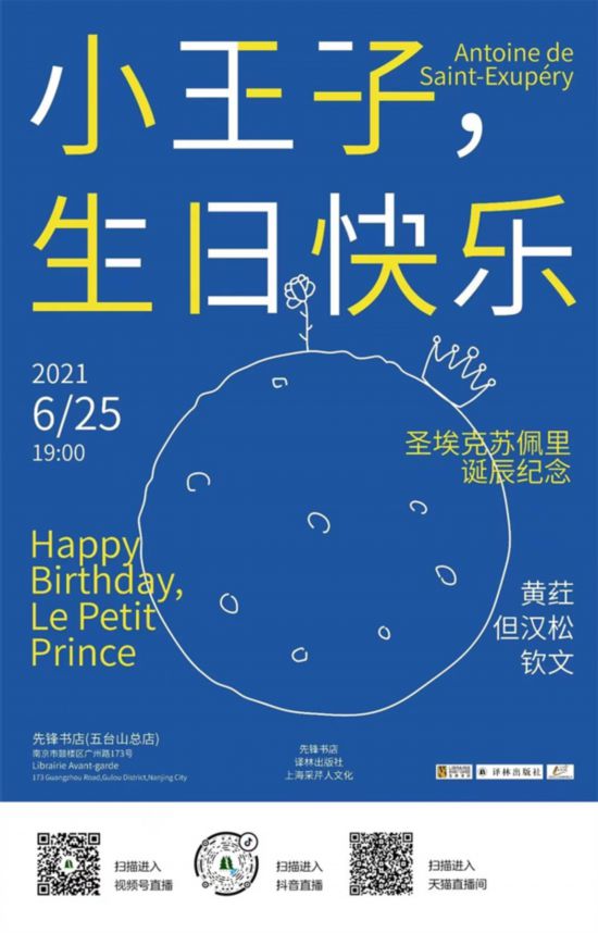 6月29日是法國(guó)著名作家圣??颂K佩里誕辰。他筆下的《小王子》被譯成300多種語(yǔ)言,觸動(dòng)了無(wú)數(shù)心靈。6月25日晚,南京大學(xué)法語(yǔ)系教授黃葒將攜其譯作《小王子》《小王子百科》,以及普利策獎(jiǎng)得主希夫所作《小王子的星辰與玫瑰:圣??颂K佩里傳》,與南京大學(xué)外院但漢松教授、欽文老師一起做客先鋒書(shū)店,回顧圣??颂K佩里浪漫壯懷的一生,分享對(duì)《小王子》等作品的深入理解,以小王子熱愛(ài)者的身份,紀(jì)念圣埃克蘇佩里121周年誕辰。