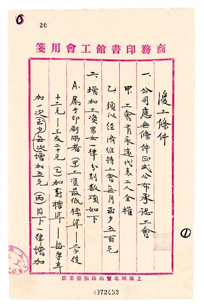 1925年8月,商務(wù)印書(shū)館爆發(fā)了“要求加薪及平等待遇大同盟罷工”。8月24日,13位職工代表舉行聯(lián)席會(huì)議,商訂復(fù)工條件,沈雁冰負(fù)責(zé)執(zhí)筆起草談判文件,在會(huì)議當(dāng)場(chǎng)寫(xiě)成了這份《復(fù)工條件》。《復(fù)工條件》包括“公司應(yīng)無(wú)條件正式公布承認(rèn)工會(huì)”“增加工資”“減短每日工作時(shí)間”等九項(xiàng)內(nèi)容。