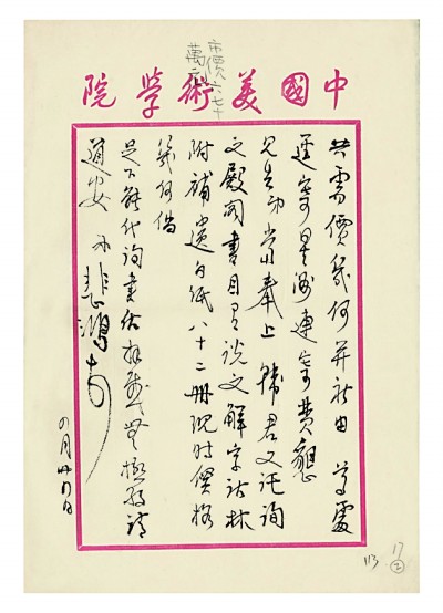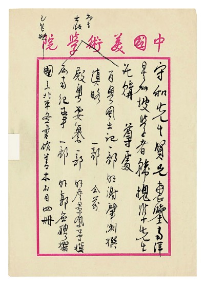 袁同禮(1895—1965),字守和,主持北平圖書(shū)館(今中國(guó)國(guó)家圖書(shū)館)工作22年,奠定了中國(guó)現(xiàn)代圖書(shū)館的基礎(chǔ),推動(dòng)了我國(guó)圖書(shū)館事業(yè)的發(fā)展,特別是抗戰(zhàn)時(shí)期,他廣泛尋求文化合作互助,為中國(guó)學(xué)術(shù)文化事業(yè)、文化抗戰(zhàn)及與世界的文化交流作出了積極貢獻(xiàn)。該信展示了徐悲鴻與袁同禮之間關(guān)于購(gòu)書(shū)等事的交往。