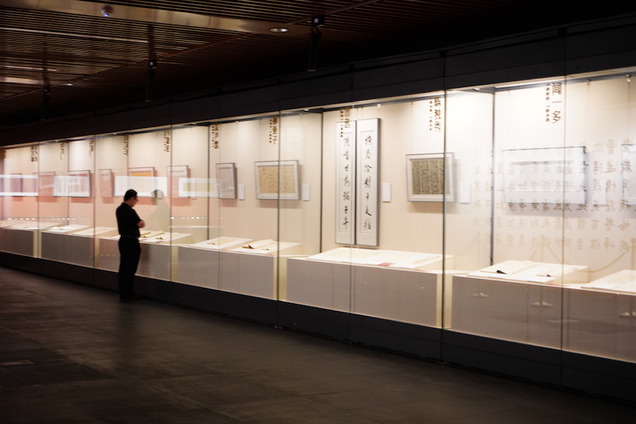 澎湃新聞記者在展覽的“光昭九域”篇看到,展廳布置素凈通透,展架上陳列的是名家手稿真跡或復制件,附有展牌介紹,墻上則懸掛著當代書法家書寫的該名家的其他作品,以形成某種呼應并體現出追慕先賢和新的藝術詮釋的意味。
