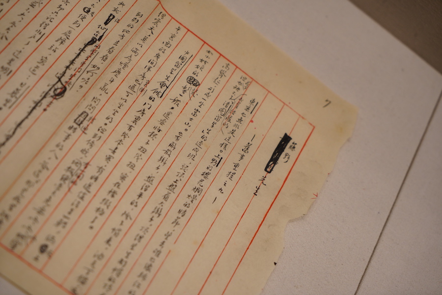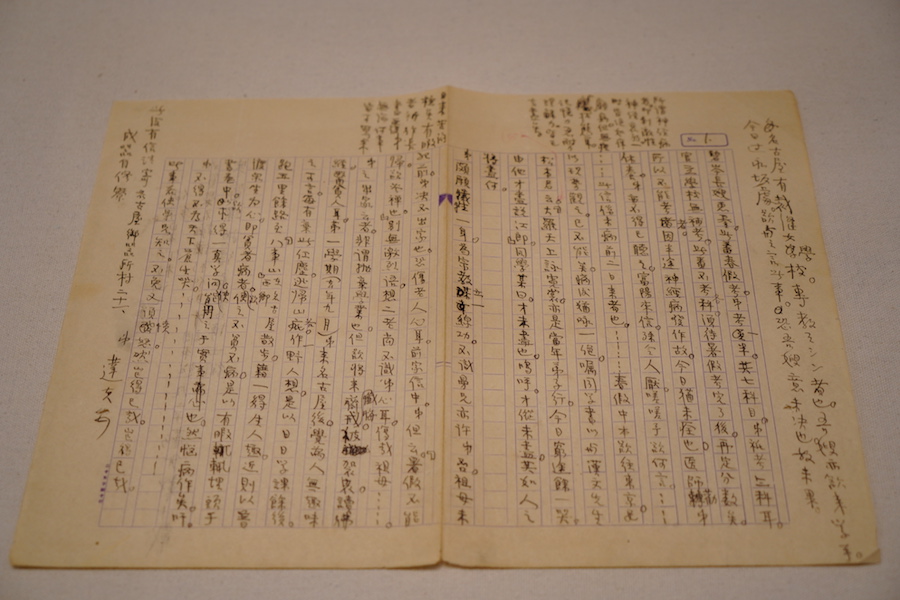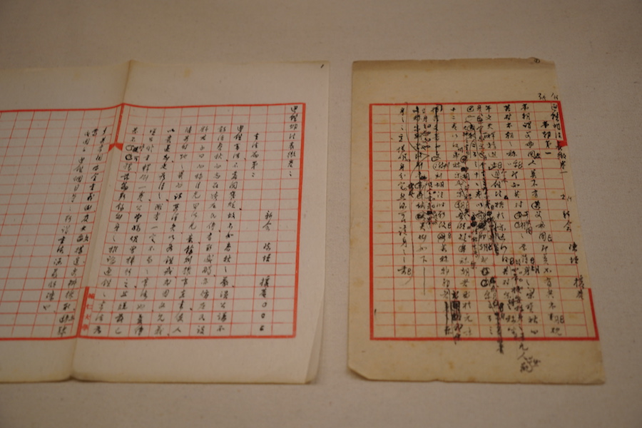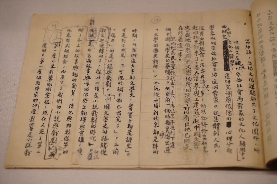 1946年7月15日,聞一多被國民黨特務暗殺身亡,同年11月,清華大學成立“整理聞一多先生遺著委員會”,由朱自清領銜,發(fā)動清華大學中國文學系同仁搜集、整理、抄寫聞一多未刊遺稿,后出版。展覽現場中展出一件朱自清手書的序言,其中多處修改,也提及聞一多“終于要研究起唯物史觀,要在這個基礎上建筑起中國文學史”。