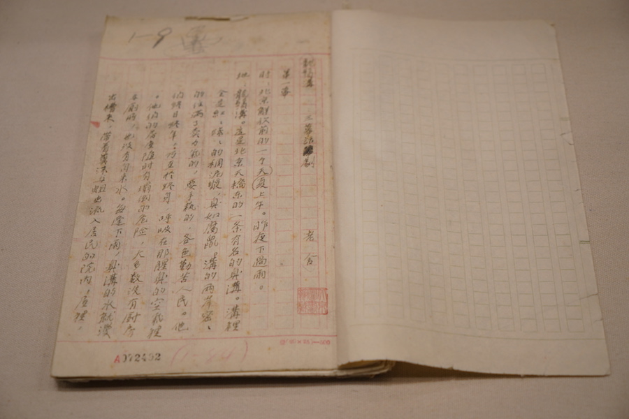 現代文學家們的手稿也“現身”本次展覽中,老舍以大量相關文史資料及實地調查為基礎,于1950年創(chuàng)作了話劇《龍須溝》,描寫北京龍須溝居民解放前后生活的變化。