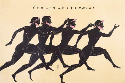 表現(xiàn)賽跑的瓶畫圖案。古希臘賽會中,田徑賽含200米短跑、400米雙程跑、4800米長跑、著盔甲跑400米等項目。 資料圖片