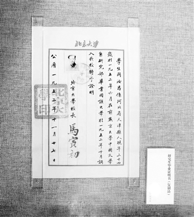 如此看來,周汝昌的燕京大學(xué)中文研究生學(xué)歷確實存在疑問。但是等到周汝昌去世六年后,2018年他百年祭的時候,恭王府里的周汝昌紀(jì)念館展出了一張紙(復(fù)制品),可以視為周家子女們作出的回答。不是畢業(yè)證書,而是特殊年代的特殊證明。
