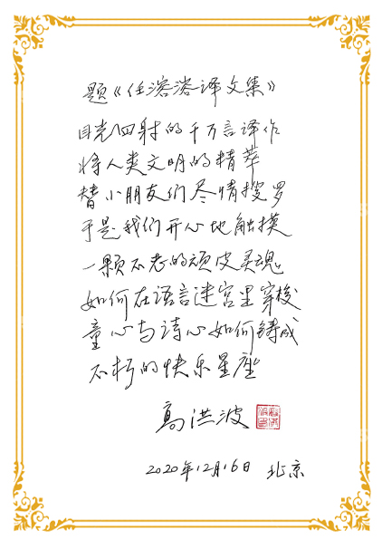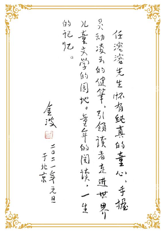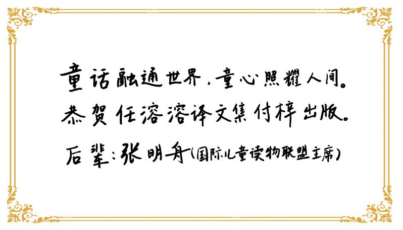 中國作家協(xié)會副主席、中國作協(xié)兒童文學(xué)委員會主任高洪波為該文集題獻(xiàn):“目光四射的千萬言譯作,將人類文明的精萃,替小朋友們盡情搜羅,于是我們開心地觸摸一顆不老的頑皮靈魂,如何在語言迷宮里穿梭,童心與詩心如何鑄成不朽的快樂星座。”詩人、兒童文學(xué)作家金波為譯文集題寫的推薦語這樣說:“任溶溶先生懷有純真的童心,手握靈動凌云的健筆,引領(lǐng)讀者走進(jìn)世界兒童文學(xué)的園地,童年的閱讀,一生的記憶?!薄巴捜谕ㄊ澜?,童心照耀人間。”國際兒童讀物聯(lián)盟(IBBY)主席張明舟也題詞祝賀任溶溶譯文集付梓出版。