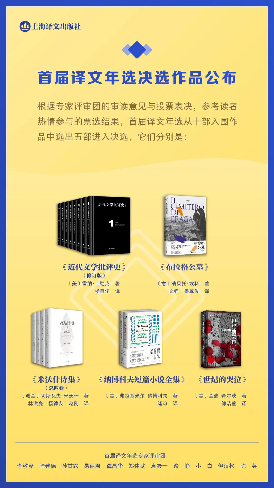 評選活動面向近三年由上海譯文出版社出版的外國文學(xué)類首譯作品,或有重要學(xué)術(shù)價值的重譯作品。選出10部入圍作品,交由專家評審團(tuán)評審,從中遴選5部決選作品,最終決出“譯文年選”最佳譯作。