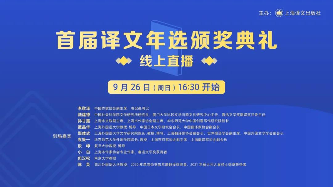2021年9月26日,專家評審團(tuán)將討論決定首屆“譯文年選”獲獎作品,并視頻直播頒獎典禮。屆時,譯文君會提前發(fā)布直播二維碼,誠邀各位讀者在線觀看。