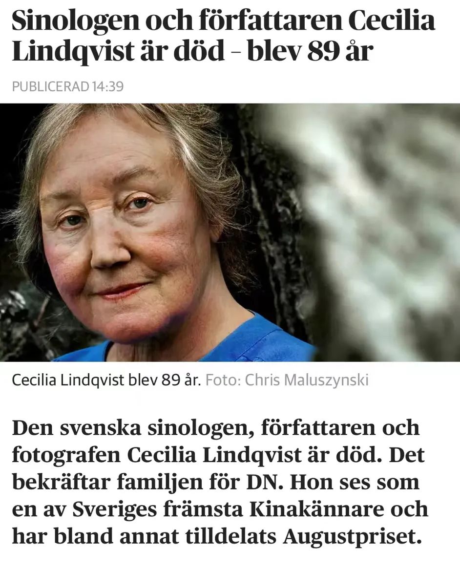 澎湃新聞從活字文化方面獲悉,瑞典漢學(xué)家林西莉(Cecilia Lindqvist)于當(dāng)?shù)貢r間上周日(9月26日)去世,享年89歲。1950年代末,林西莉跟隨瑞典漢學(xué)家高本漢(Klas Bernhard Johannes Karlgren)學(xué)習(xí)漢語。1961年至1962年,林西莉來到北大讀書求學(xué),此后曾數(shù)十次到中國訪問。