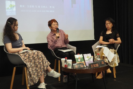 10月10日,復旦大學中文系教授、評論家王宏圖(中),復旦大學新聞系教授、評論家馬凌(右)與文學編輯李燦做客朵云書院旗艦店,就托卡爾丘克的長篇小說《世界墳墓中安娜·尹》展開對談。