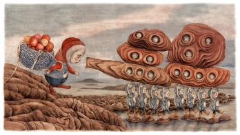 獲得本屆插畫展年度大獎(jiǎng)的系列作品《神秘世界之旅》由德國插畫師索尼婭·達(dá)諾夫斯基(Sonja Danowski)創(chuàng)作。作品描繪了一個(gè)神秘的世界,那兒有奇異的植物、嶙峋的石質(zhì)房屋以及一群神奇的生物。這群生物雖然大小不一、本領(lǐng)各異,卻懂得互惠互助,共同創(chuàng)造了一個(gè)精彩、有趣的宜居家園。作者索尼婭還曾為曹文軒和方素珍等著名中國兒童文學(xué)作家的圖書創(chuàng)作插畫。
