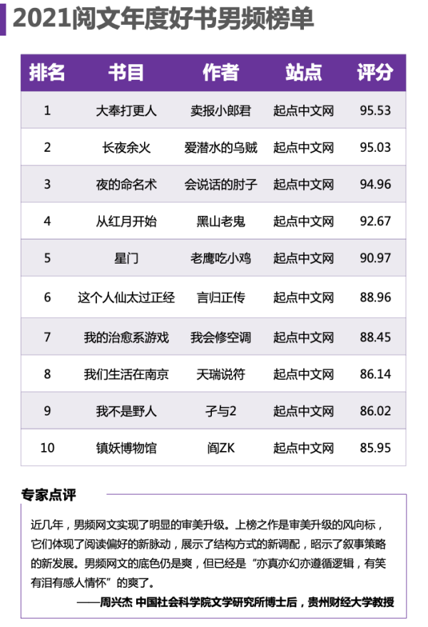 “近幾年,男頻網(wǎng)文實現(xiàn)了明顯的審美升級?!?中國社會科學院文學研究所博士后、貴州財經(jīng)大學教授周興杰評價,《2021閱文年度好書榜》的男頻榜單,客觀反映了好書品質(zhì),網(wǎng)文的腦洞要大,邏輯要通,才能受人追捧。盡管男頻網(wǎng)文底色未變,但實現(xiàn)“爽”的方式以及“爽”的耐受有了明顯拔高,已經(jīng)是“亦真亦幻亦遵循邏輯,有笑有淚有感人情懷”的爽了。