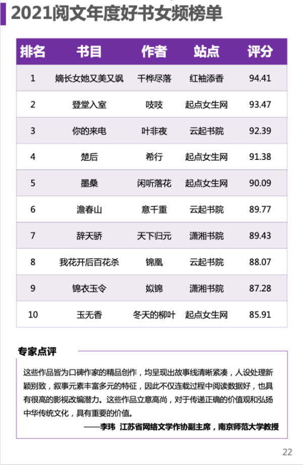 “上榜女頻作品均呈現(xiàn)出故事線清晰緊湊,人設處理新穎別致,敘事元素豐富多元的特征,因此不僅連載過程中閱讀數(shù)據(jù)好,也具有很高的影視改編潛力。這些作品立意高尚,對于傳遞正確的價值觀和弘揚中華傳統(tǒng)文化,具有重要的價值。” 江蘇省網(wǎng)絡文學作協(xié)副主席、南京師范大學教授李瑋評價。