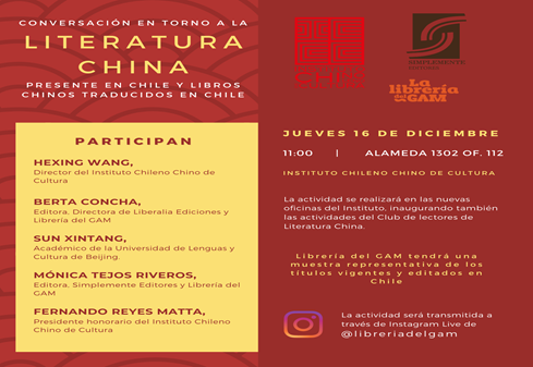 2021年12月16日,智利“中國文學讀者俱樂部”在位于智利圣地亞哥市中心的“智中文化協(xié)會”新辦公室正式掛牌揭幕,并舉行了首場活動“中國文學對話會”。智中文協(xié)主席、前智利駐華大使雷耶斯·馬塔教授、辛普雷門特出版社社長莫妮卡·特霍斯、雷特拉里亞出版社社長貝爾塔·貢恰、智中文化藝術中心主席胡安·卡洛斯·拉米雷斯和雷斯基金會主席卡洛斯·雷耶斯等現(xiàn)場出席了活動,北京語言大學拉美研究中心主任、阿根廷國會大學教授孫新堂線上參加?;顒赢斕爝M行了直播,有60多位讀者線上參加了活動。
