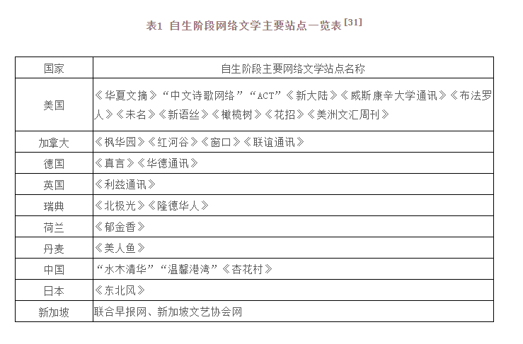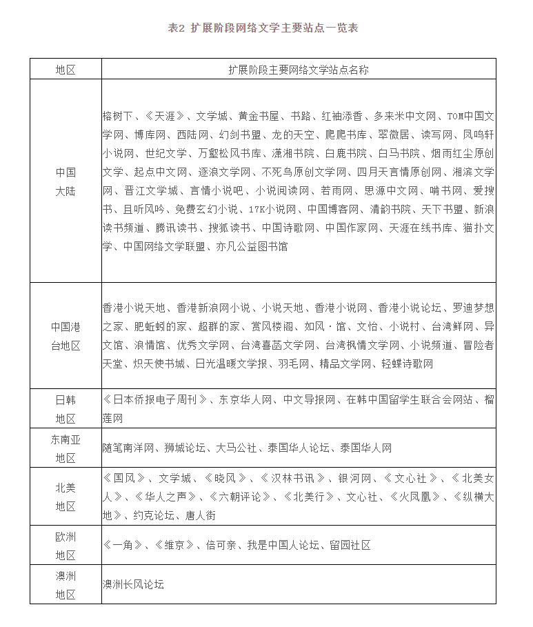 [31]自生階段網(wǎng)絡(luò)文學(xué)主要站點(diǎn)一覽表:表中站點(diǎn)統(tǒng)計(jì)以域名注冊所在地作為地區(qū)劃分標(biāo)準(zhǔn)。