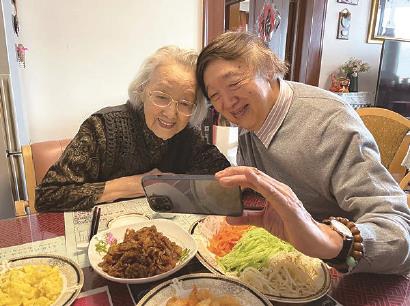 馮驥才陪媽媽吃壽面,自拍留影