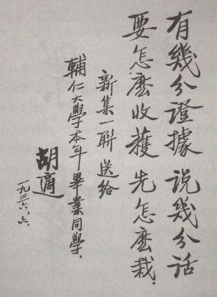 出任輔仁大學(xué)董事前,胡適已與輔仁大學(xué)有過(guò)關(guān)聯(lián)。試舉一例:1934年1月11日,胡適在輔仁大學(xué)國(guó)文系作了題為《考證學(xué)方法之來(lái)歷》的演講。這次演講,顯然與陳垣到胡家登門拜訪有關(guān)。演講中,胡適證明了“樸學(xué)方法確是地道國(guó)貨,并非舶來(lái)品”。末了,他還自我調(diào)侃:“天主教研究神學(xué),有一很好的習(xí)慣,就是凡立一新說(shuō),必推一反對(duì)論者與之駁辯,此反對(duì)論者稱做‘魔鬼的辯護(hù)師’,今天,我就做了一次‘魔鬼的辯護(hù)師’?!背鋈屋o仁大學(xué)董事后,胡適與輔仁大學(xué)關(guān)聯(lián)更多。除了參加董事會(huì)會(huì)議,還經(jīng)常有參觀、接待、演講等活動(dòng)。如,1936年6月,胡適為輔仁大學(xué)畢業(yè)學(xué)生題詞,內(nèi)容為“有幾分證據(jù)說(shuō)幾分話,要怎么收獲先怎么栽”。思想和研究都得要講究證據(jù),天下沒(méi)有白費(fèi)的努力,這都是作為師者的胡適一貫主張和強(qiáng)調(diào)的。