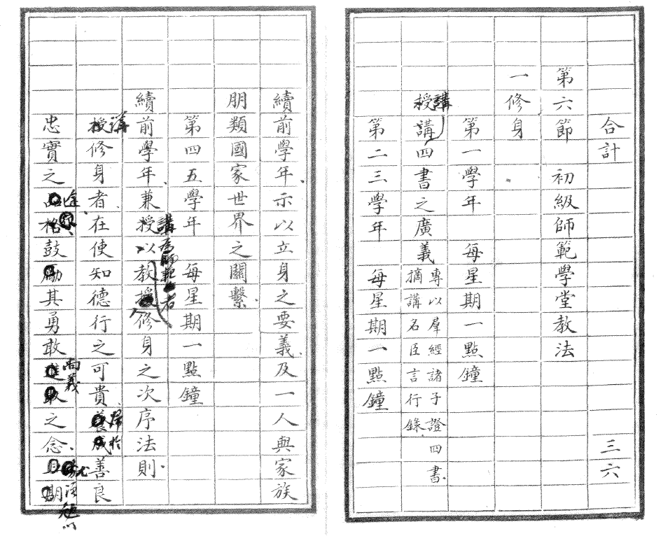 1904年初,癸卯學(xué)制對(duì)修身的目的及教法有更細(xì)致的規(guī)定。初等小學(xué)堂摘講朱子《小學(xué)》、劉宗周《人譜》及各種養(yǎng)蒙圖說(shuō),讀有益風(fēng)化之古詩(shī)歌,為兒童立“愛(ài)國(guó)家之根基”[10]。在師資稀缺的地區(qū),另立“簡(jiǎn)易科”,將修身課與讀經(jīng)課合而為一,于講經(jīng)時(shí)帶講修身。《奏定初等小學(xué)堂章程》對(duì)修身科的設(shè)想,有三點(diǎn)值得注意:一是把明儒劉宗周的《人譜》作為修身教科書(shū)[11],二是以諷誦古詩(shī)歌作為幼童涵養(yǎng)性情之道[12],三是修身與讀經(jīng)在鄉(xiāng)野之地可合并講授。高等小學(xué)堂的修身科,每星期2鐘點(diǎn),講授“四書(shū)”要義,“以朱注為主,以切于身心日用為用”;共四學(xué)年,每年修身科的課程內(nèi)容相同,而讀經(jīng)講經(jīng)科則有程度之遞進(jìn),從《詩(shī)》《書(shū)》到更艱深的《易經(jīng)》及《儀禮》節(jié)本,每周課時(shí)是修身科的6倍。[13]