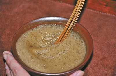 第三步:繼續(xù)續(xù)水,繼續(xù)攪拌,泡沫越來越厚,茶湯越來越白