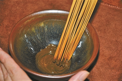趙盼兒在第一集還表演了“茶百戲”,用一根小竹棍兒蘸著茶粉,在黃綠色的茶湯泡沫上畫畫。這種表演是福建茶人章志峰先生在二十年前根據(jù)自己的理解“復(fù)原”出來的,跟宋代文獻(xiàn)里的記載并不一致。