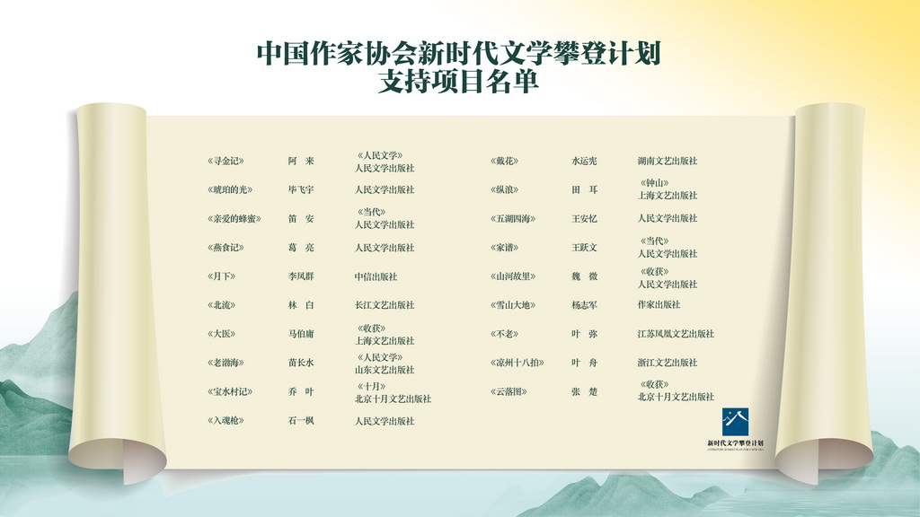 “新時代文學(xué)攀登計劃”是由中國作協(xié)牽頭,聯(lián)合全國重點文藝類出版社和文學(xué)期刊、圖書公司、影視公司、網(wǎng)絡(luò)文學(xué)網(wǎng)站以及文化類網(wǎng)絡(luò)平臺,成立新時代文學(xué)攀登計劃聯(lián)席會議,由成員單位定期向中國作協(xié)推薦申報優(yōu)質(zhì)選題,從作家創(chuàng)作、編輯出版、宣傳推廣、成果轉(zhuǎn)化、對外譯介等多方面統(tǒng)籌協(xié)調(diào),形成聯(lián)動機制,助力打造優(yōu)秀文學(xué)作品。啟動儀式上公布了“新時代文學(xué)攀登計劃”的第一批支持項目名單,包括阿來的《尋金記》、畢飛宇的《琥珀的光》、王安憶的《五湖四?!返?9部作品。