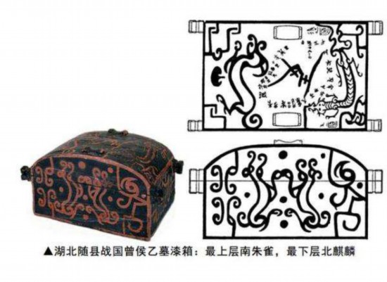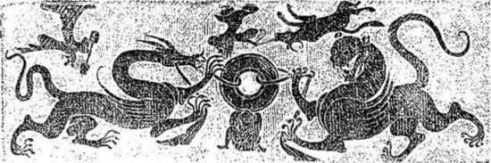 1973年四川郫縣新勝鄉(xiāng)出土石棺棺蓋,上圖為青龍、白虎捧璧,下圖為牛郎織女局部