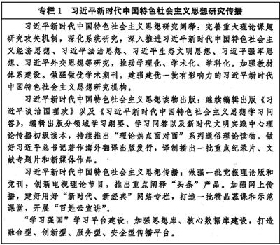 把學(xué)習(xí)宣傳貫徹習(xí)近平新時代中國特色社會主義思想作為長期重大政治任務(wù),完善持續(xù)深入學(xué)習(xí)的常態(tài)化長效化機制,健全用黨的創(chuàng)新理論武裝全黨、教育人民的工作體系。編輯出版習(xí)近平總書記系列重要著作。加強對習(xí)近平新時代中國特色社會主義思想整體性系統(tǒng)性研究、學(xué)理性闡釋和學(xué)科性建設(shè),加強對實現(xiàn)馬克思主義中國化新的飛躍的重大原創(chuàng)性貢獻的研究闡釋宣傳。持續(xù)開展中國特色社會主義和中國夢宣傳教育。完善黨委(黨組)理論學(xué)習(xí)中心組等各層級學(xué)習(xí)制度,組織開展列席旁聽和督促檢查。持續(xù)開展黨員大規(guī)模輪訓(xùn)。綜合運用全媒體方式、大眾化語言、藝術(shù)化形式,結(jié)合黨治國理政的生動實踐和歷史性成就,全方位、多層次開展對象化、分眾化、互動化理論宣傳普及。創(chuàng)新高等學(xué)校思政課內(nèi)容和方式,鼓勵文化名家講思政課,打造思政精品課程,推動黨的創(chuàng)新理論進教材、進課堂、進學(xué)生頭腦。(見專欄1)