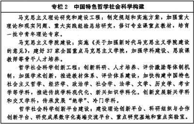 把習(xí)近平新時代中國特色社會主義思想貫穿哲學(xué)社會科學(xué)各領(lǐng)域各學(xué)科,加快構(gòu)建中國特色哲學(xué)社會科學(xué),推進學(xué)科體系、學(xué)術(shù)體系、話語體系建設(shè)和創(chuàng)新。加強頂層設(shè)計和統(tǒng)籌協(xié)調(diào),制定中長期發(fā)展規(guī)劃。加強學(xué)科基礎(chǔ)理論建設(shè),打造具有中國特色的理論學(xué)派。深化當代中國馬克思主義政治經(jīng)濟學(xué)研究。堅持問題導(dǎo)向,圍繞事關(guān)黨和國家事業(yè)發(fā)展全局的戰(zhàn)略問題,推出一批扎根中國大地、聚焦偉大實踐、反映時代特征的原創(chuàng)性、標志性科研成果,推動重大學(xué)術(shù)成果國際化傳播。培育高效整合國內(nèi)外學(xué)術(shù)資源、引領(lǐng)學(xué)科創(chuàng)新發(fā)展的學(xué)術(shù)平臺。充分發(fā)揮國家社會科學(xué)基金示范引導(dǎo)作用。深入推進中國特色新型智庫建設(shè)。(見專欄2)(見專欄3)