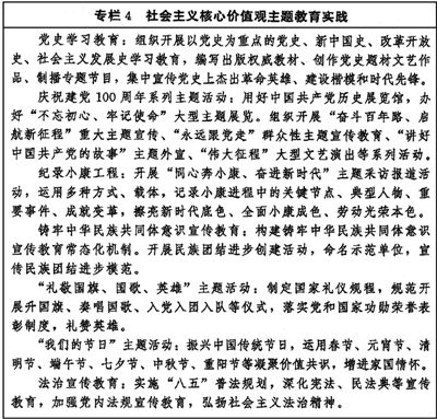 持續(xù)深化社會主義核心價值觀宣傳教育,增進認知認同、樹立鮮明導(dǎo)向、強化示范帶動。堅持貫穿結(jié)合融入、落細落小落實,把社會主義核心價值觀要求融入日常生活,融入法治建設(shè)。推動理想信念教育常態(tài)化制度化,筑牢黨員干部、青少年等重點群體的理想信念之基。圍繞“七一”、“八一”、“十一”等重大時間節(jié)點,依托革命歷史類紀念設(shè)施、遺址和愛國主義教育基地等載體,加強愛國主義、集體主義、社會主義教育,弘揚黨和人民在各個歷史時期奮斗中形成的偉大精神。加強公益廣告宣傳。統(tǒng)籌開展誠信教育、勤儉節(jié)約教育、勞動創(chuàng)造幸福主題宣傳教育。強化祖國統(tǒng)一和民族團結(jié)進步宣傳教育,深化“一國兩制”實踐教育,強化全民國防教育,促進平安中國建設(shè)。(見專欄4)