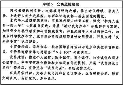 傳承弘揚中華傳統(tǒng)美德,加強社會公德、職業(yè)道德、家庭美德、個人品德建設(shè),加強家庭、家教、家風(fēng)建設(shè)。加強對革命、建設(shè)、改革時期各類先進典型的學(xué)習(xí)宣傳,尊崇褒揚英雄模范,關(guān)心關(guān)愛先進典型人物。健全家庭、學(xué)校、政府、社會相結(jié)合的思想道德教育體系,把立德樹人貫穿學(xué)校教育全過程。發(fā)揮優(yōu)秀文化產(chǎn)品陶冶道德情操的作用,完善市民公約、鄉(xiāng)規(guī)民約、學(xué)生守則、團體章程等社會規(guī)范,廣泛開展弘揚時代新風(fēng)行動,深化道德領(lǐng)域突出問題治理。加強農(nóng)村思想道德建設(shè),創(chuàng)新文化科技衛(wèi)生“三下鄉(xiāng)”長效機制。(見專欄5)