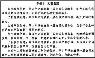 以實施文明創(chuàng)建工程為抓手,推動文明培育、文明實踐、文明創(chuàng)建不斷深入。創(chuàng)造性開展文明城市、文明村鎮(zhèn)、文明單位、文明家庭、文明校園和未成年人思想道德建設(shè)工作先進等精神文明創(chuàng)建活動,拓展新時代文明實踐中心建設(shè)。弘揚科學(xué)精神,深入開展愛國衛(wèi)生運動,深化文明餐桌行動和“光盤行動”,倡導(dǎo)文明健康、綠色環(huán)保的生活方式。健全志愿服務(wù)體系,廣泛開展志愿服務(wù)關(guān)愛行動。加強網(wǎng)絡(luò)文明建設(shè)。(見專欄6)(見專欄7)
